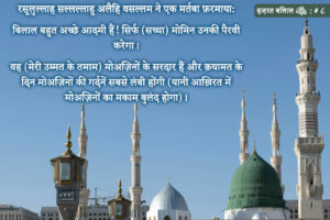 قال رسول الله صلى الله عليه وسلم: نعم المرء بلال، ولا يتبعه إلا مؤمن، وهو سيد المؤذنين (من أمتي)، والمؤذنون أطول الناس أعناقا يوم القيامة (أي: يكونون من أصحاب الرتب العالية في الآخرة). (المعجم الكبير، الرقم: ٥١١٩) रसूलुल्लाह सल्लल्लाहु अलैहि वसल्लम ने एक मर्तबा फ़रमाया: बिलाल बहुत अच्छे आदमी हैं! …